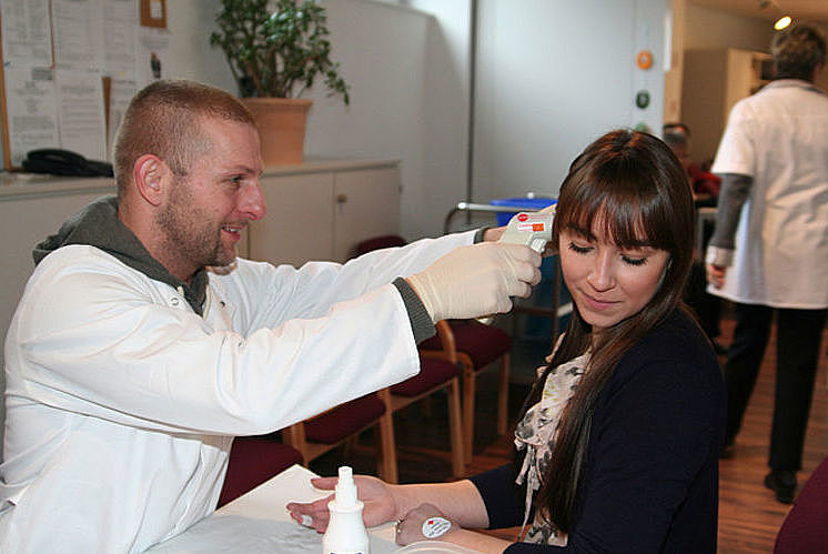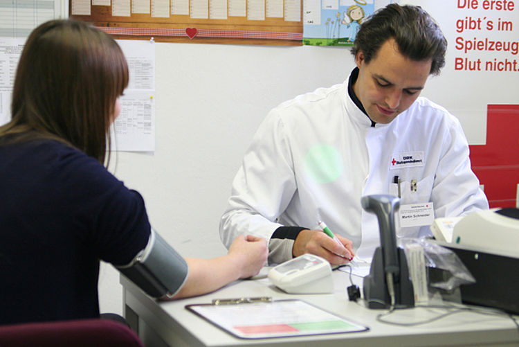 Danach werden die Körpertemperatur (im Ohr) und der Blutfarbstoffgehalt (Hämoglobinwert) festgestellt. Ein winziges Tröpfchen aus der Fingerkuppe oder dem Ohrläppchen reicht dafür aus. Blutdruck und Puls werden gemessen und alle Werte werden dokumentiert. Diese Daten geben zusammen mit dem ausgefüllten Anamnese-Fragebogen dem Arzt wertvolle Hinweise für seine Entscheidung über die Zulassung zur Blutspende